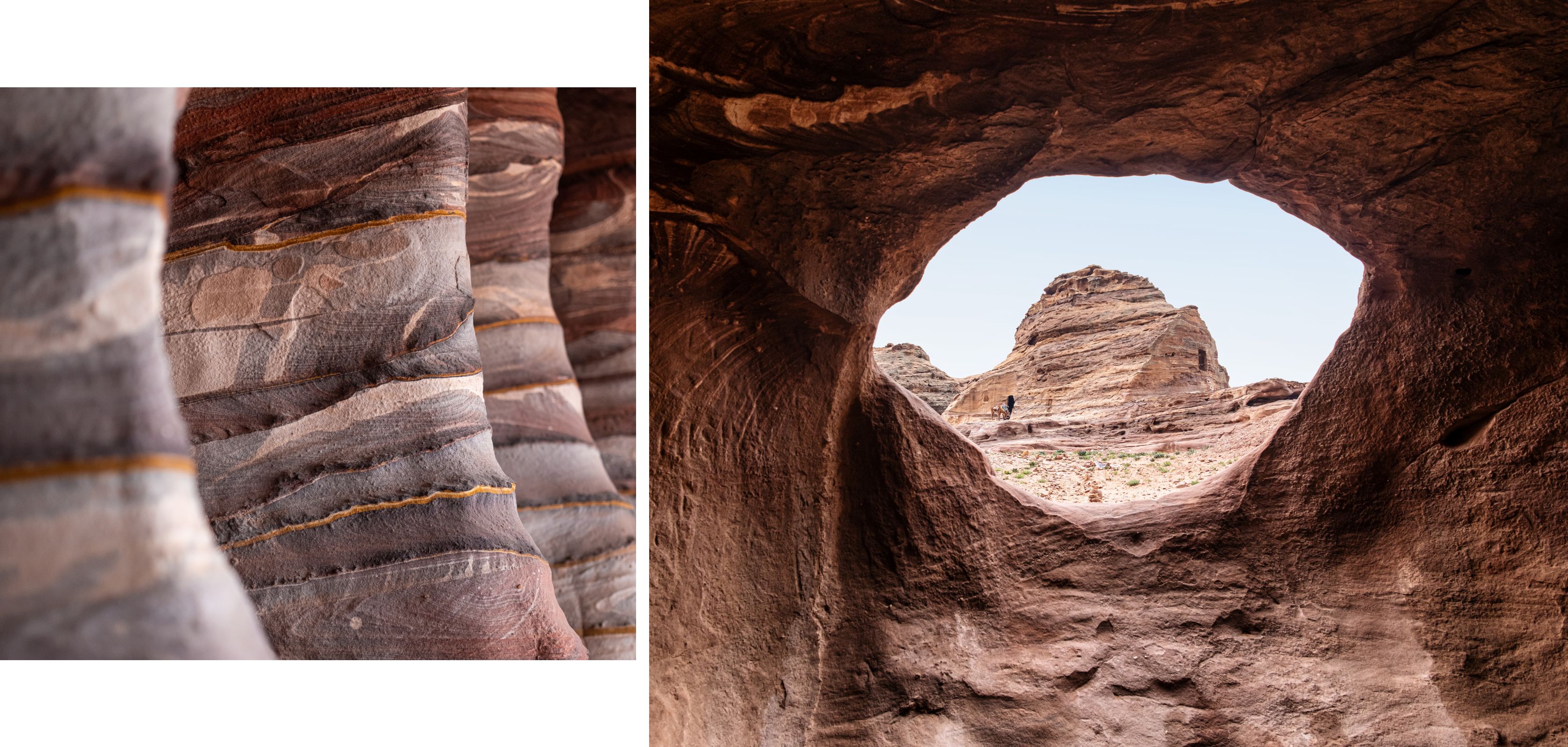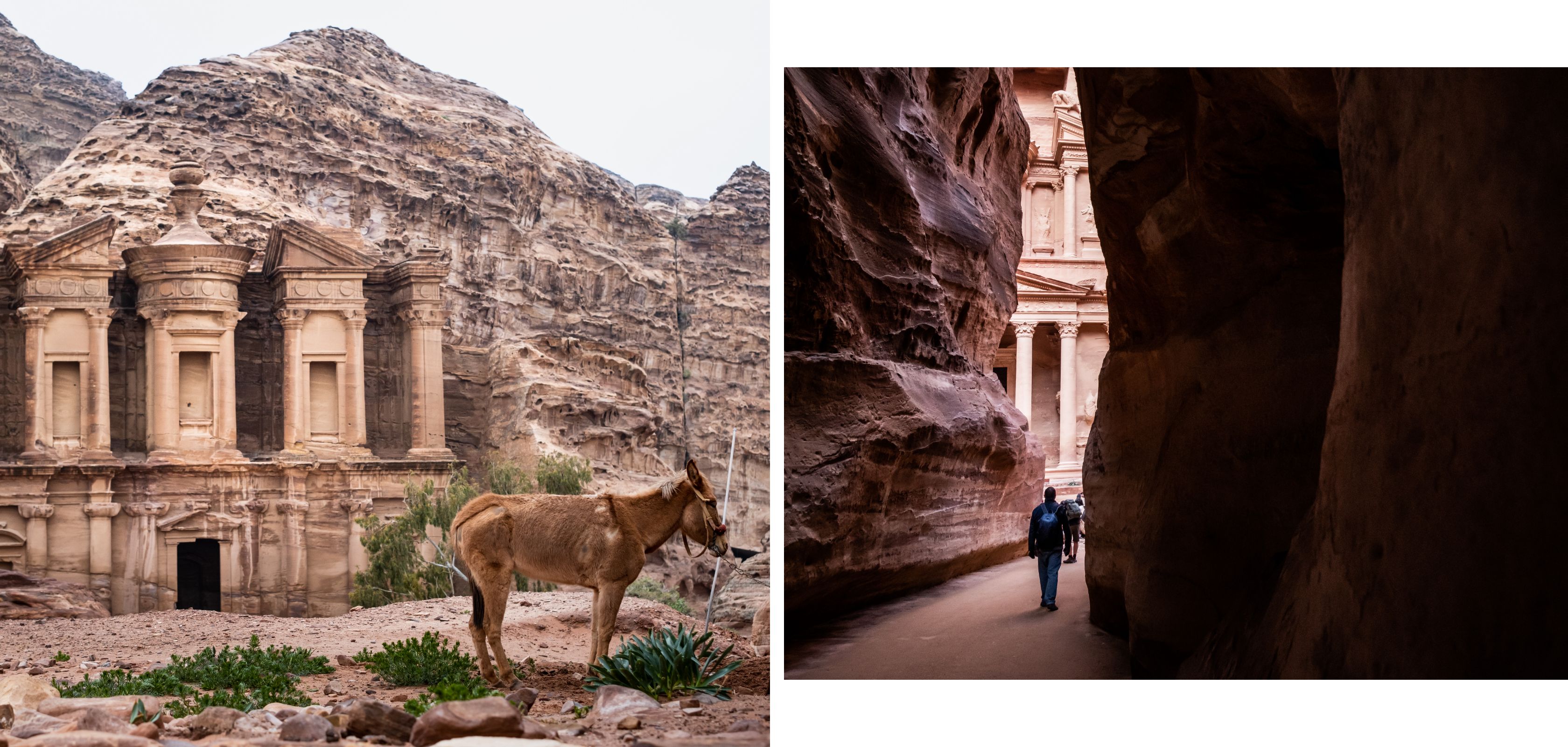 Le cinquième jour, nous entrons à Pétra par la petite porte. C’est une nouvelle merveille du monde, un chef-d’œuvre taillé dans la roche – ce n’est pas un hasard si, en grec, « Pétra » signifie « rocher » ! Le magnifique repaire des Nabatéens, peuple arabe du désert qui a contrôlé le commerce de l’encens dans cette région pendant des centaines d’années. La paix et la tranquillité cèdent la place à des hordes de touristes. Heureusement, Ghassab a grandi à Pétra – il nous montre même la grotte où il est né. Il connaît tous les raccourcis et se faufile entre les rochers. Loin des touristes, nous grimpons une paroi rocheuse. En un clin d’œil, nous pouvons à nouveau profiter du paysage.