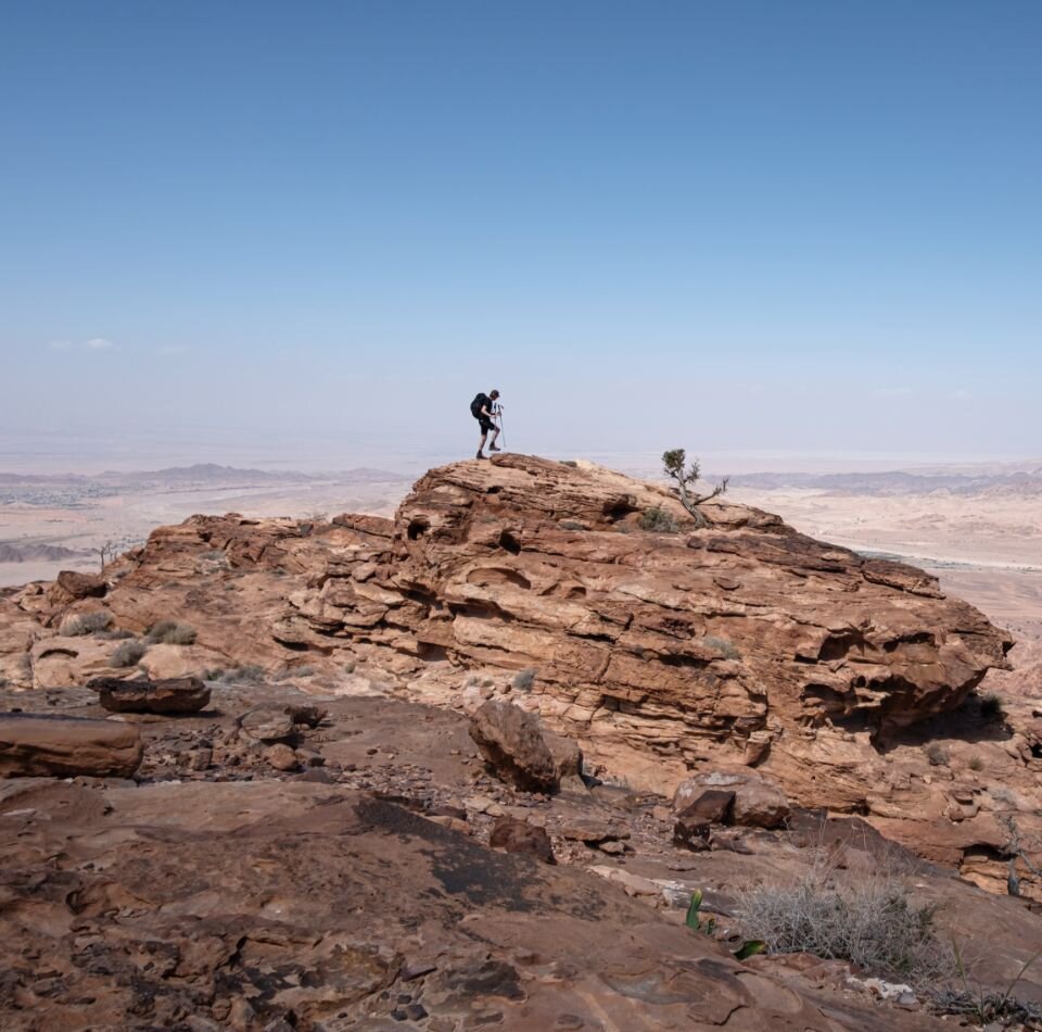 En parlant de nature, la région peut parfois sembler austère et aride, mais elle grouille de vie, même si elle se cache parfois bien. Sous nos chaussures de montagne, nous remarquons des scorpions morts, des piquants de porcs-épics et des crottes de renards faméliques. Au-dessus de nos têtes, huit buses féroces profitent des ascendances thermiques. Nous les comptons, encore et encore, comme pour nous convaincre que nous ne rêvons pas. C’est le printemps, la nature est à son apogée ! Au loin, on entend un âne sauvage et un coucou. Une huppe fasciée prend peur et s’envole brusquement d’un buisson. Ici et là, nous admirons une explosion de couleurs : les lauriers roses, l’écarlate des coquelicots, le jaune des adonis d’été et le violet des globulaires d’Arabie. Dans le désert, le tableau a presque l’air décadent, mais la nature règne en maître.